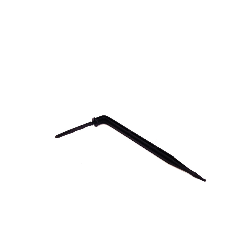 Кутова крапельниця-спиця — це ефективний інструмент для точкового прикореневого поливу. Завдяки своїй вигнутій формі, вона надійно фіксується в ґрунті або субстраті та спрямовує потік води точно до кореневої системи рослини. Це ідеальне рішення для систем мікрозрошення в теплицях, на грядках, а також для поливу кімнатних та контейнерних рослин.