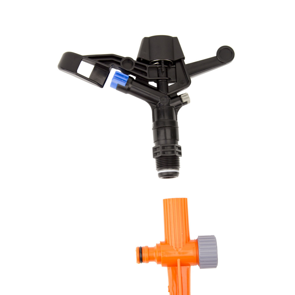 Принцип імпульсного обертання дозволяє дробити струмінь на краплі різного розміру, що імітує природні опади, запобігає утворенню калюж та зберігає структуру ґрунту. Пристрій встановлений на міцній опорній ніжці, яка легко встромляється в ґрунт і надійно утримує дощувач навіть при високому тиску води.