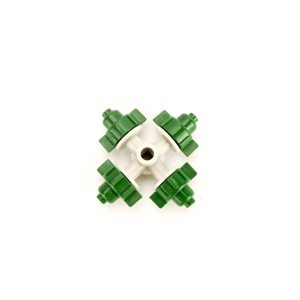 Туманоутворювач на чотири форсунки MJ 1301A застосовується для зрошення в теплицях, садах, а також незамінний при охолодженні повітря приміщенні і відкритих майданчиків. Для охолодження домашньої птиці, тварин. Виготовлений з високоякісного матеріалу, стійкий до ультрафіолету. Простота в установці та експлуатації. Встановлюється через стартер для туманоутворювачів 5141 або за допомогою набору для підвішування HMS 01 и HMS 02 . Характеристика: Артикул: MJ 1301. Тип: Туманоутворювач. Матеріал: високоякісний пластик. Кількість штук в пачці/упаковці : 100/1000 шт. Туманоутворювач на 4 форсунки: Тиск 3.5Kg 3.0Kg 2.5Kg Витрата 25.9л/час 23.5л/час 25.9л/час Радіус 0.9м 0.8м 0.6м